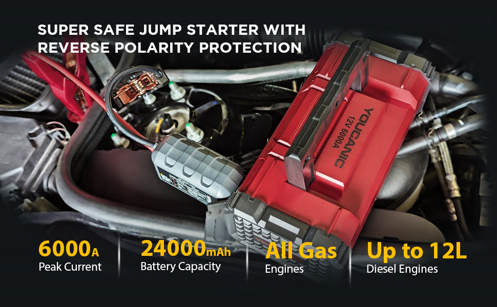 The YOUCANIC jump starter features 6000A peak cranking amps, a 24000mAh battery capacity, multiple device charging options, a compact design, built-in safety features, an LED flashlight, and multiple USB ports for versatile use and convenience.