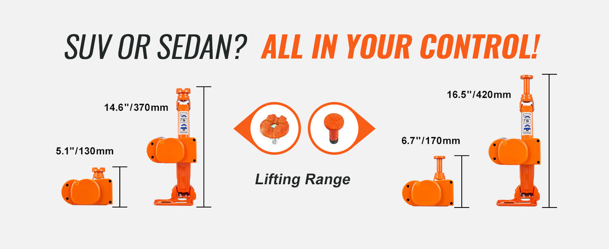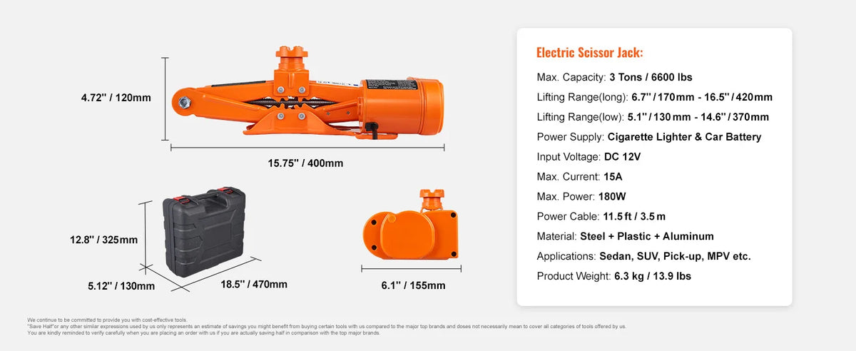 - Electric Scissor Jack Kit: Max. Capacity: 3.0 tons/6600 lbs. Lifting Range(short lifting head): 5.1''-14.6"/130-370 mm. Lifting Range (long lifting head): 6.7''-16.5"/170-420 mm. This electric car jack kit is a lifesaver during roadside emergencies and can be used for at-home garage repairs. It is suitable for sedans, SUVs, vans, or any vehicle that suits its capacity.