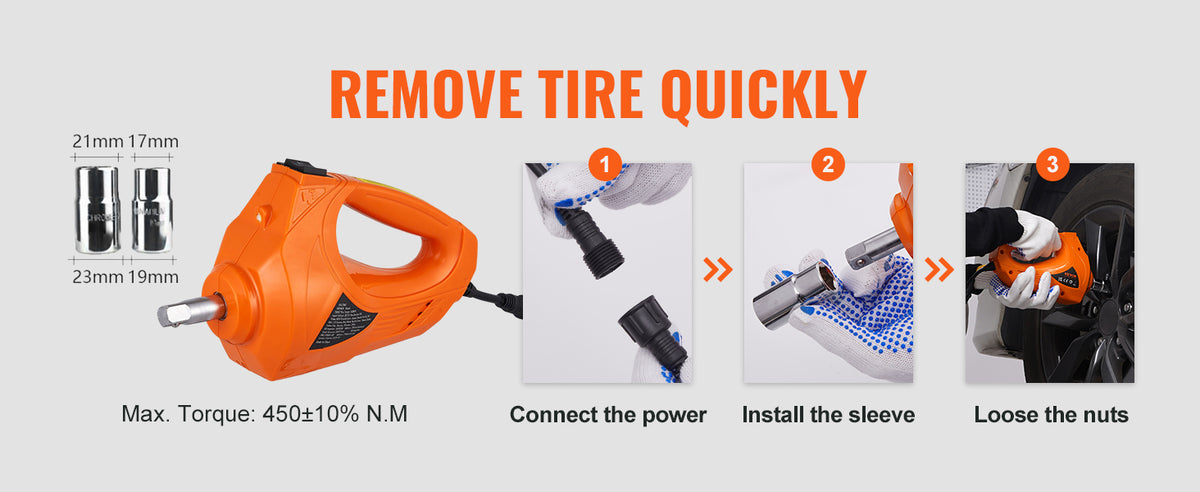 - High-efficiency Impact Wrench: With Max. Torque 450 N. M, the electric impact wrench can screw/unscrew in just a few seconds. 2 pcs sleeves are available for screws of 4 sizes (17/19 mm & 21/23 mm), matching more vehicles of various sizes of lug nuts in the market. Please select the right sleeve, and hold the power button until the screw is pulled out. It's as simple as that!