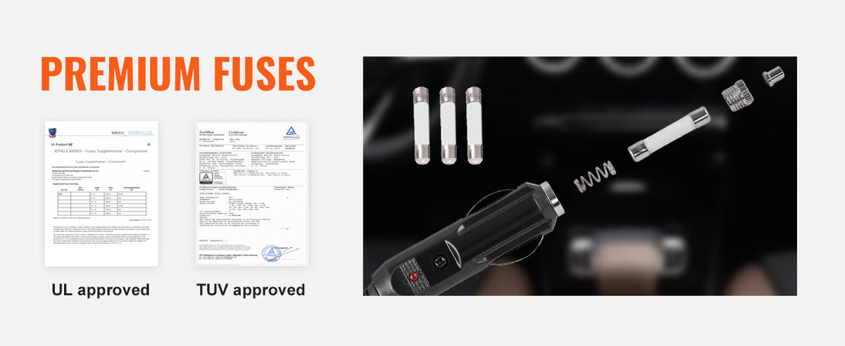 - More than 1 way to charge: The electric jack for car can be powered by a 12V cigarette lighter or car battery and equipped with an extended 11.5 feet power cord, allowing it to be set by the front or rear tire. We also provide you with three spare fuses; our fuses are TUV and-certified, ensuring a confident experience every time.
