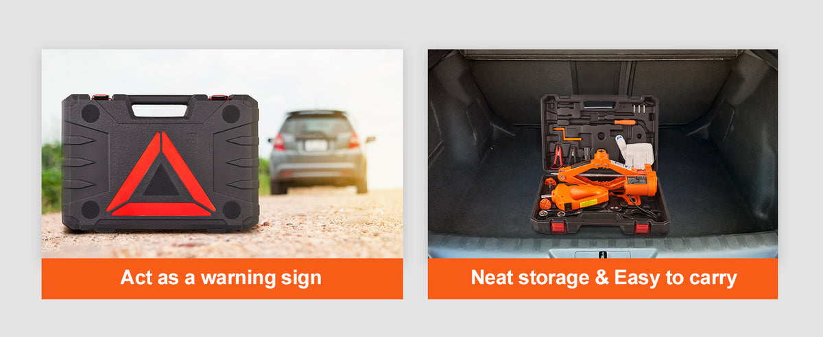 - Multi-Function Carrying Case: Everything you need to get started is provided and well organized in the toolbox. This electric jack kit includes an electric car jack, 2 pcs saddles, 3 pcs spare fuses, gloves, a battery clip, a cigarette lighter power cable, and a tough case. Additionally, a luminous red triangle on the box's exterior can be used as a warning sign when changing tires on the roadside.