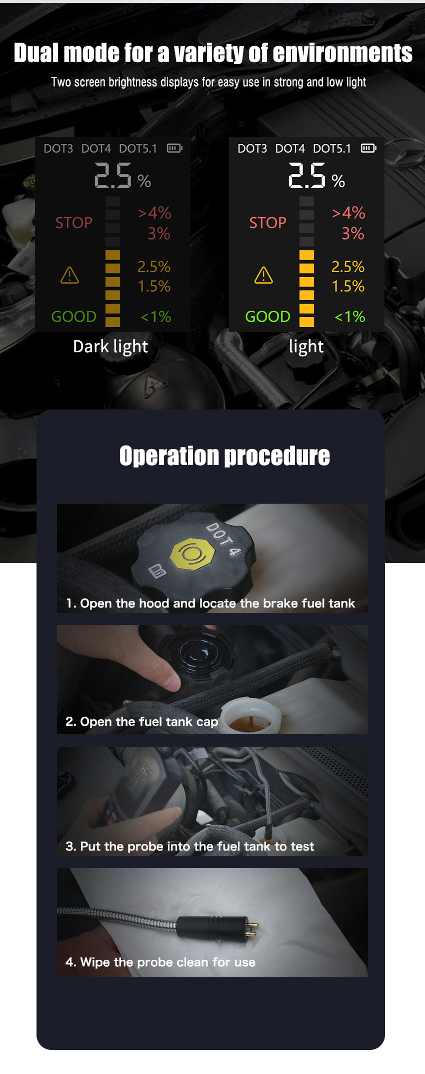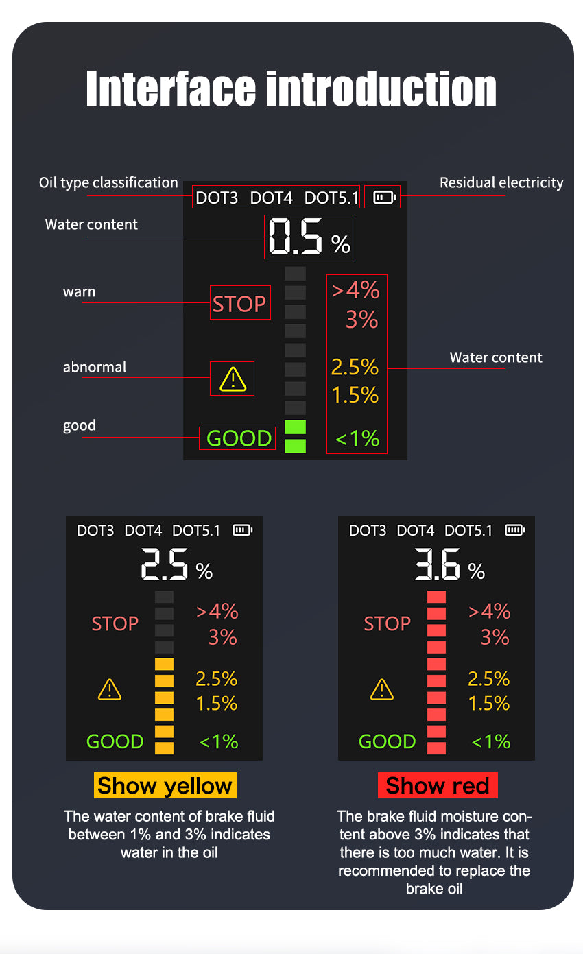 • Sensitive Universal Probe: Provides precise testing for DOT 3, DOT 4, and DOT 5.1 brake fluids.